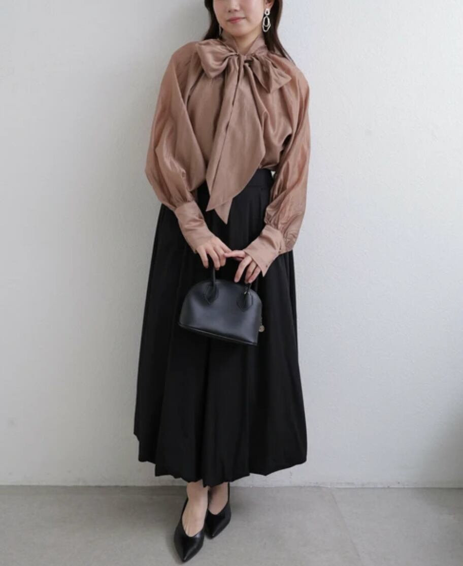 リボン部分を前に持ってきてガーリーに、袖はボリュームスリーブでふんわりシアー素材なので肌見せををするのも良し。