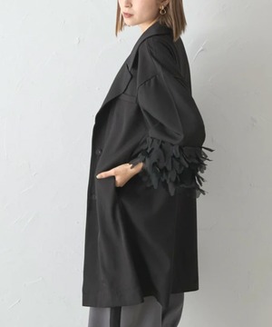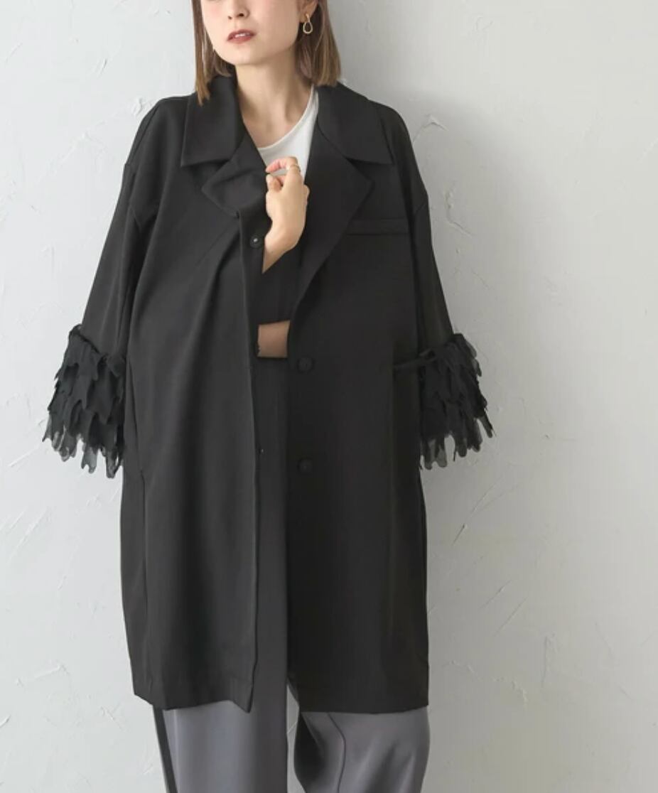 テーラードのデザインをベースにきちんと感はなくさずオーバーシルエットでカジュアルさと抜け感を、袖口のシアーレイヤードデザインが個性を人の印象に残るアウターです。