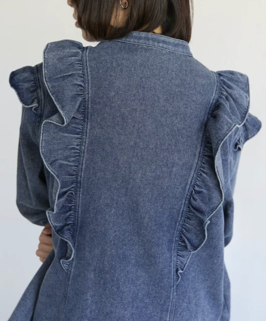 前後に施された立体的なフリルが印象的で、デニム特有のヴィンテージ感がコーディネートに深みをプラスします。