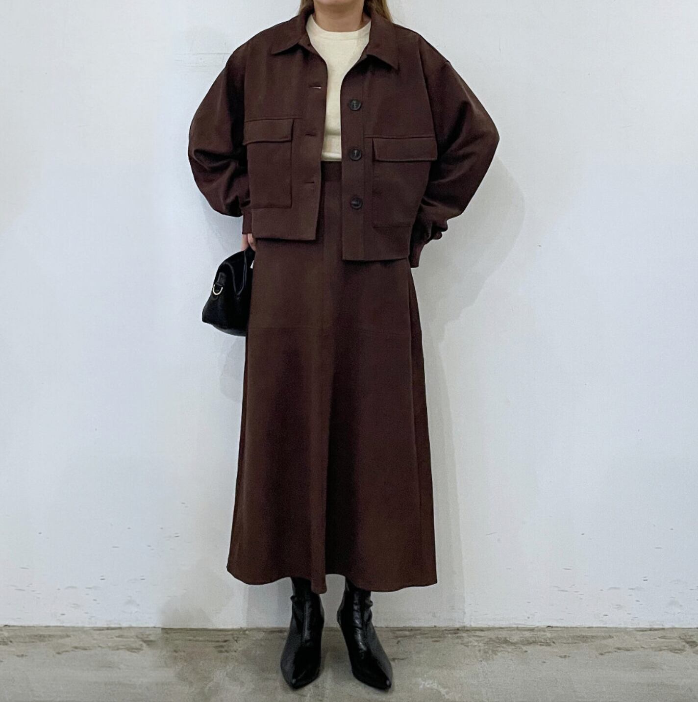 ▪️やわらかなスエード素材で仕立てたセミフレアスカート。