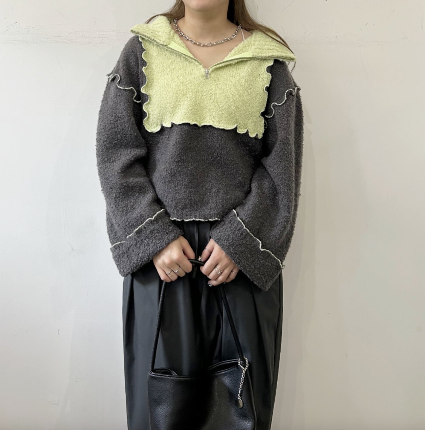 ■ 立体的なブークレ素材に、波打つような配色ステッチが印象的なハーフZIPプルオーバー。
