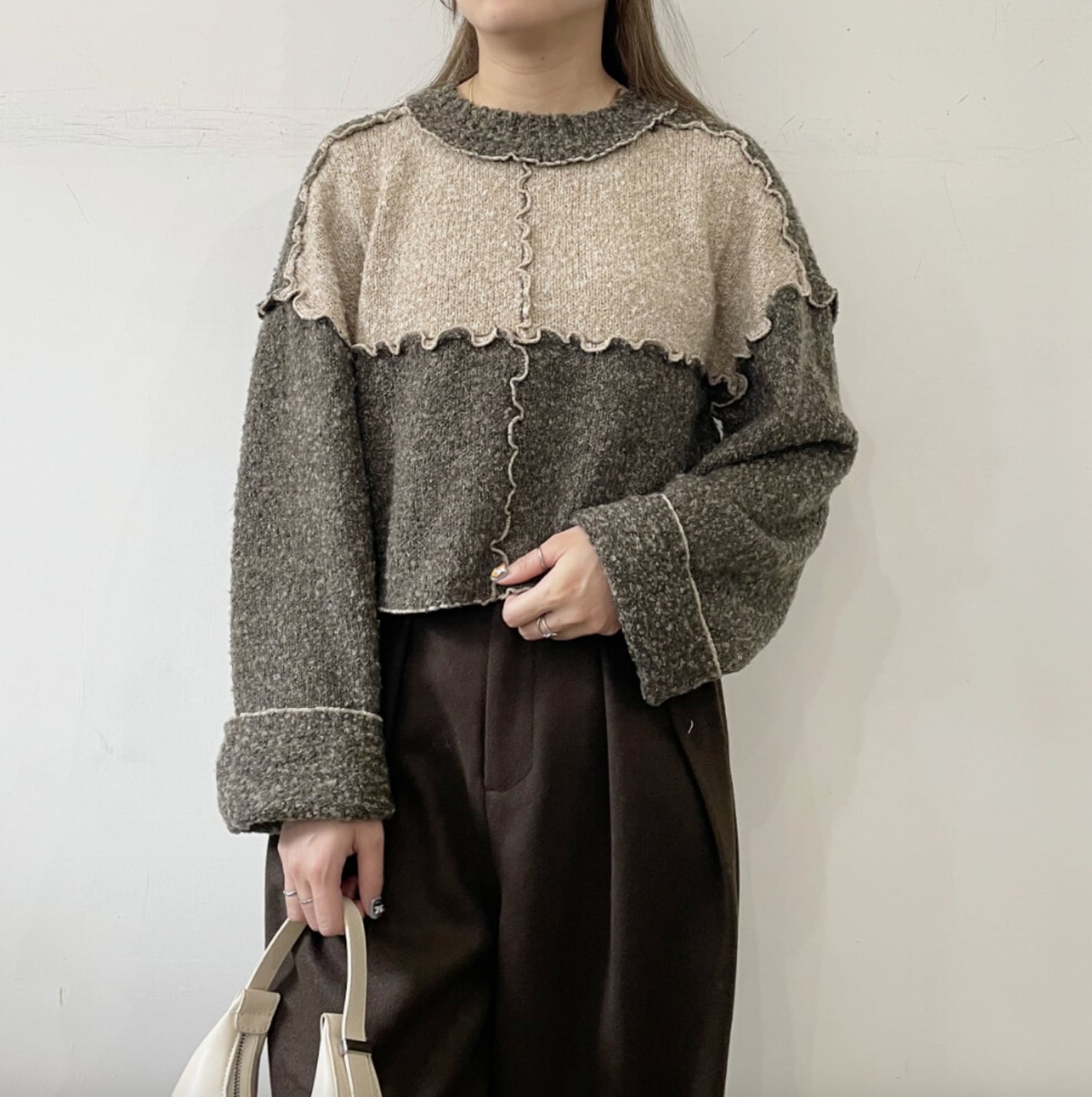 ■ 立体感のあるブークレ素材で仕立てた、バイカラーデザインのクロップドプルオーバー。