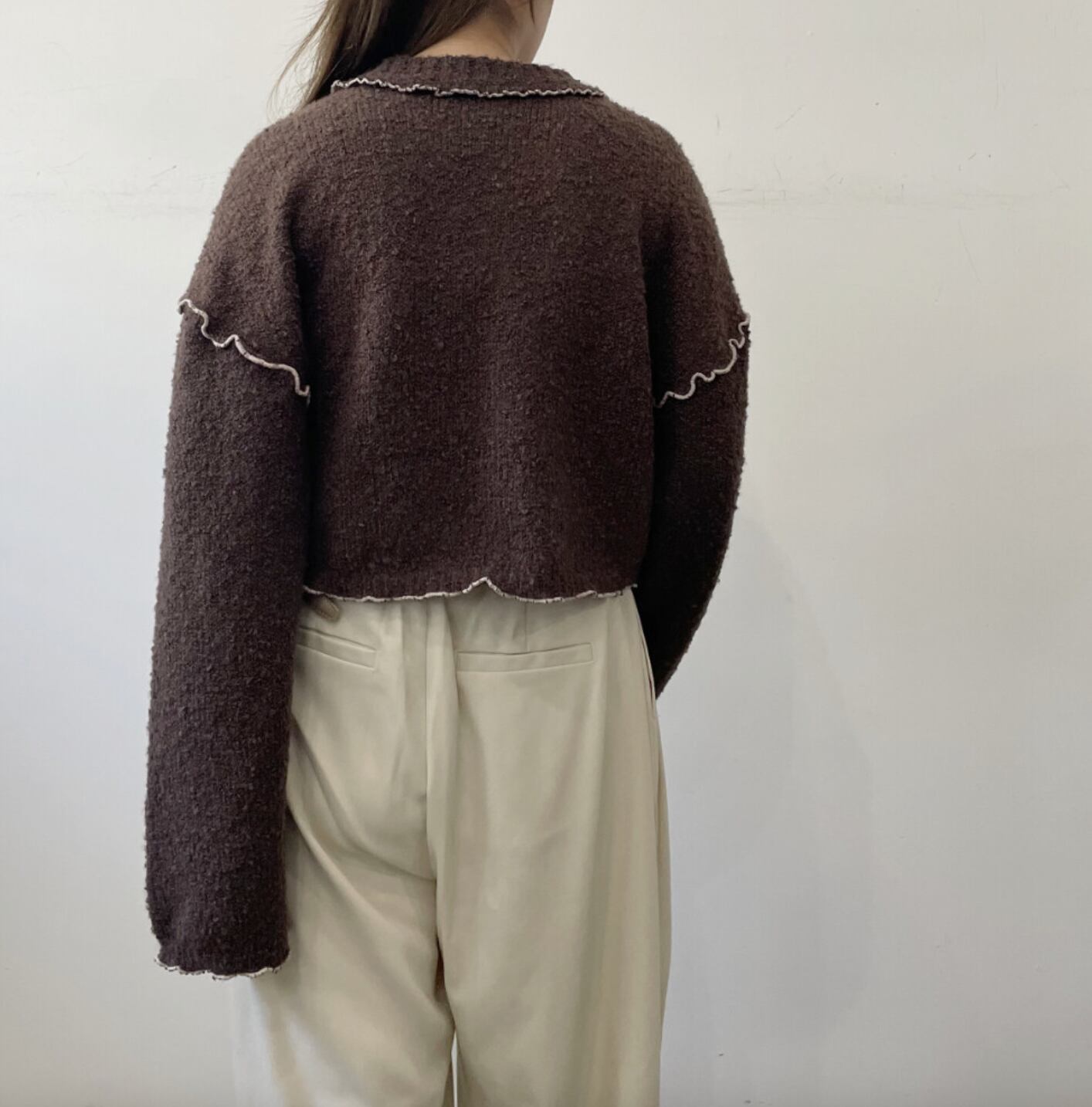 ■ 立体感のあるブークレ素材で仕立てた、バイカラーデザインのクロップドプルオーバー。
