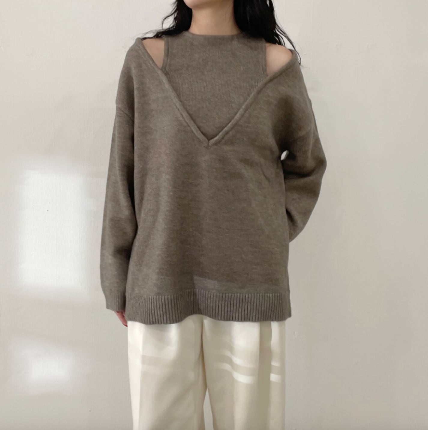 ■Vネックニットに、タンクトップを合わせたような大人っぽいスタイリングが魅力的