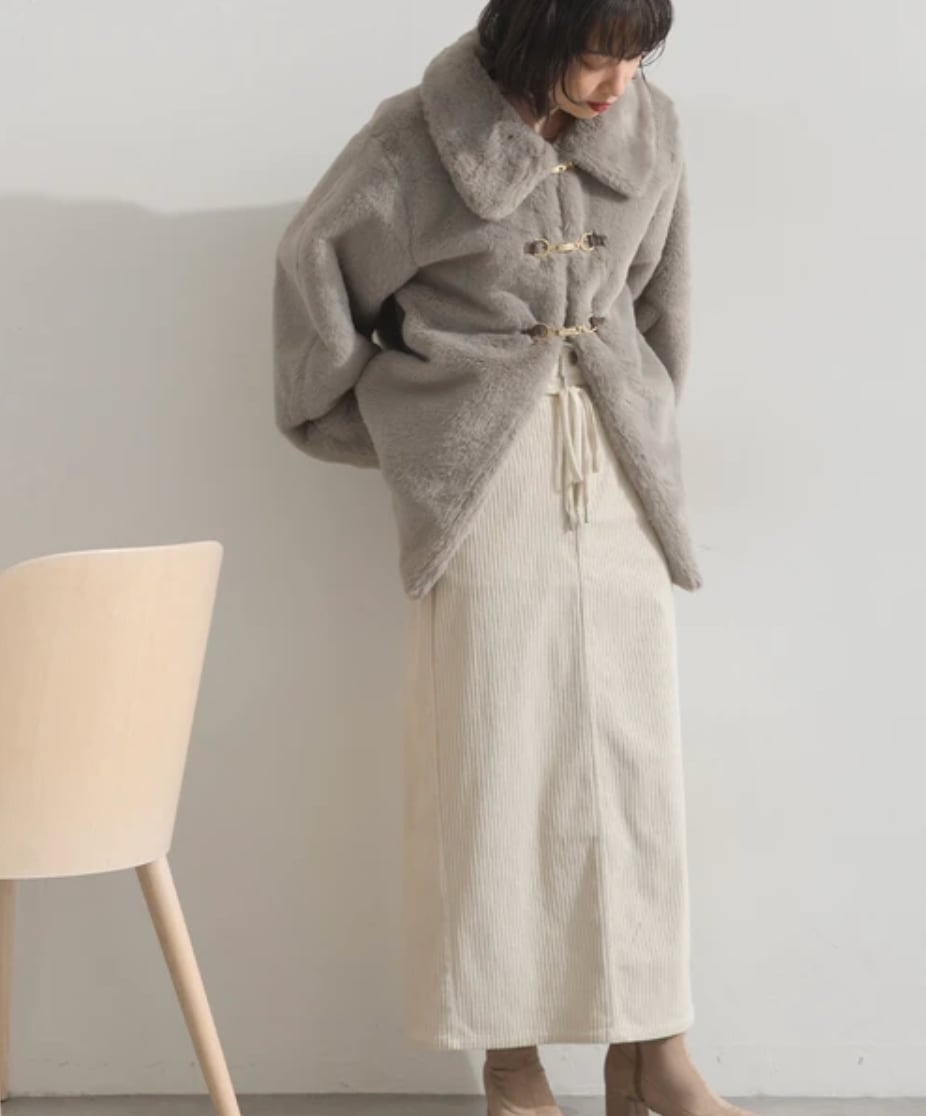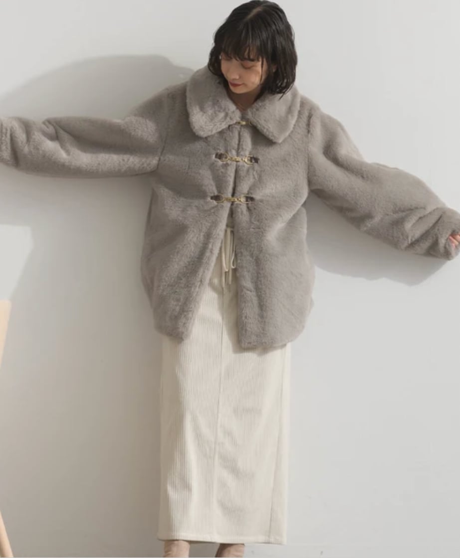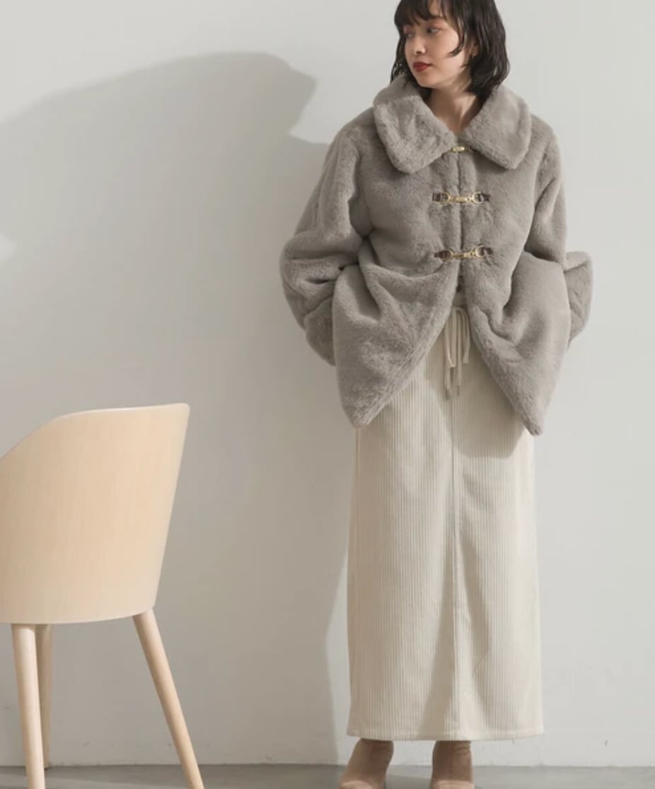 ■ふんわりと柔らかなラビット風エコファーを使用した、上品なミドル丈コート。