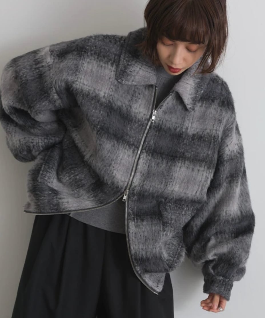 ■ふんわりとしたタッチとあたたかみのある表情が魅力の杢シャギー素材を使用したミドル丈ブルゾン。