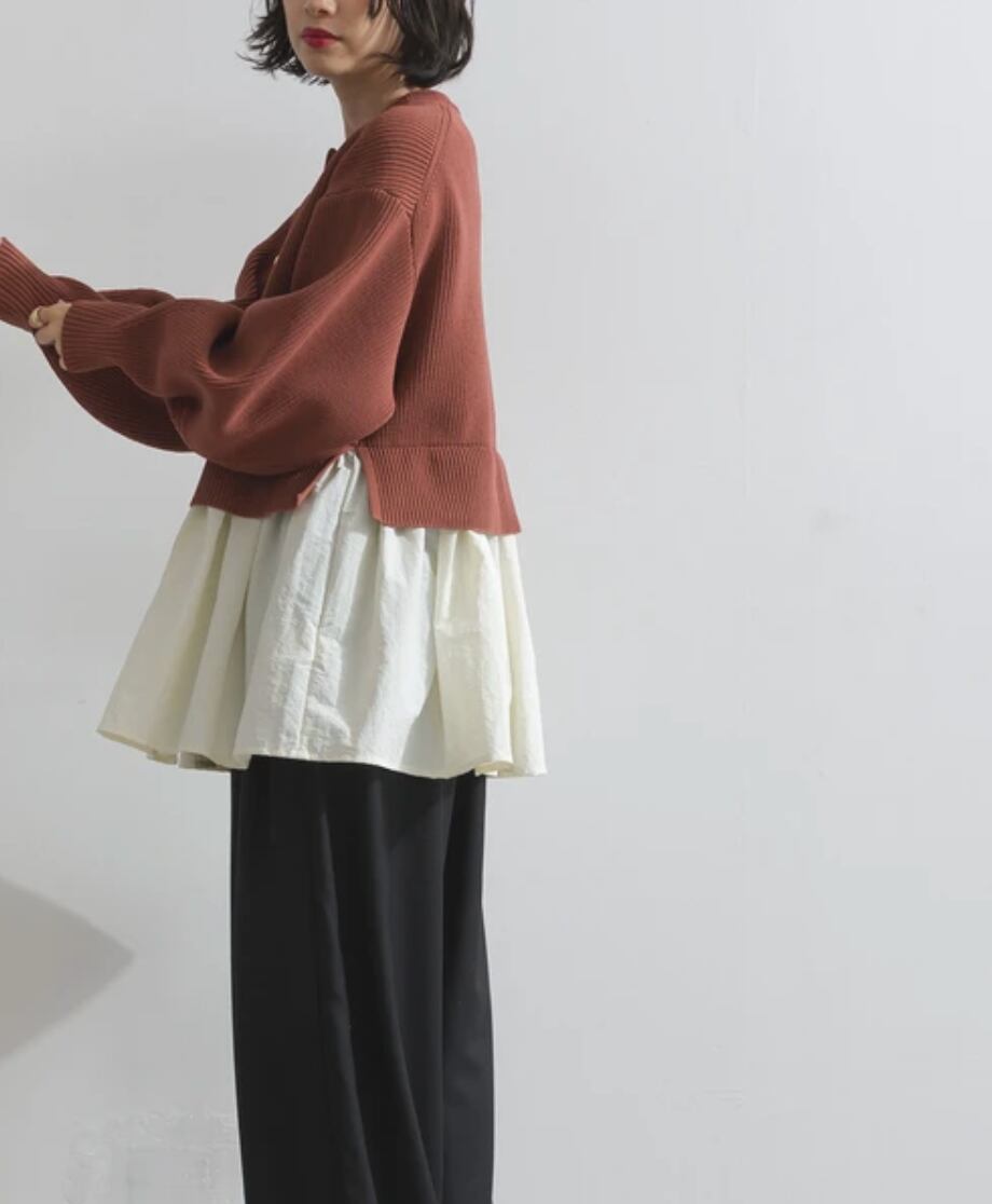 立体感のあるニットの風合いと、軽やかなシャツ素材のコントラストが新鮮な印象を演出します。