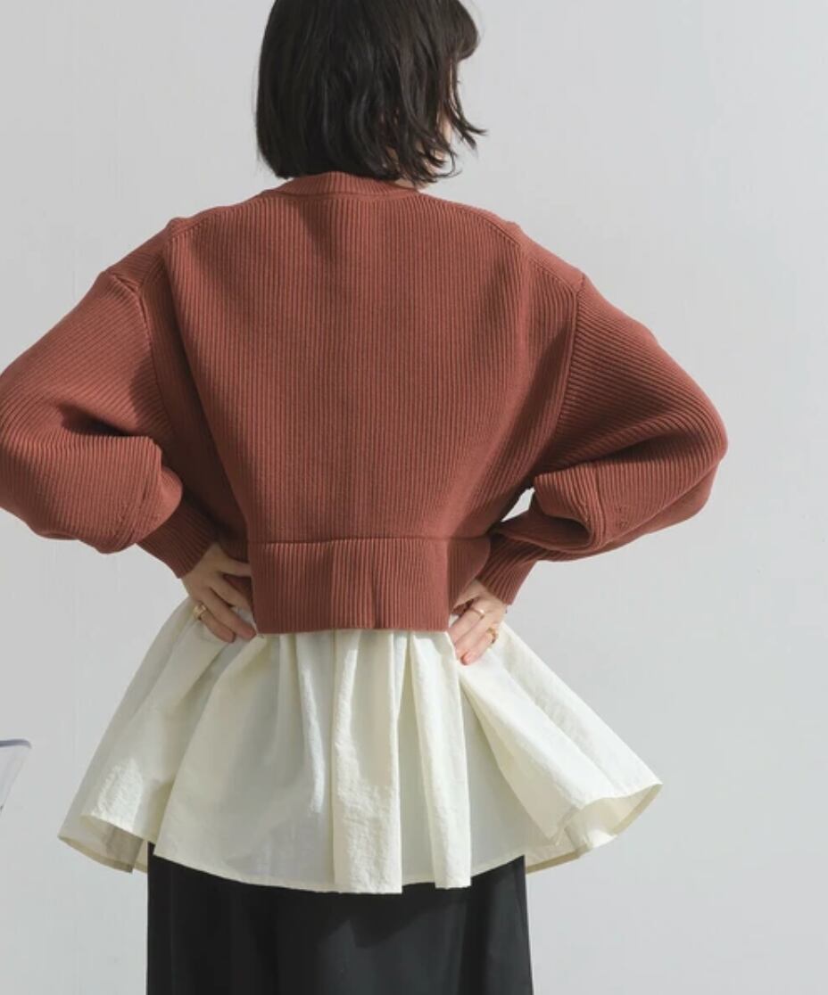 ■5GGの方畦スポンディッシュニットとナイロンシャツをドッキングした異素材MIXカーディガン。