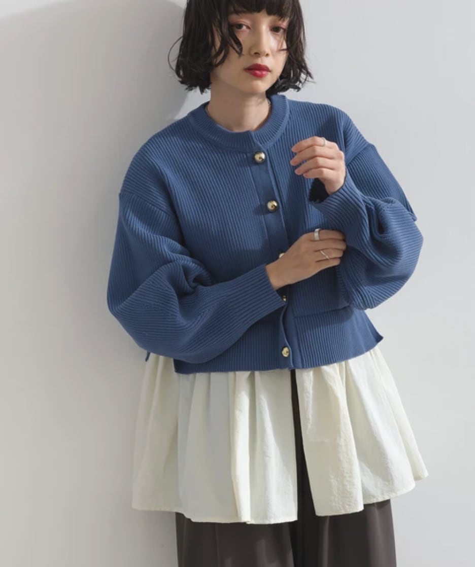 ◆A mixed-material cardigan combining a 5GG ribbed spongy knit with a nylon shirt.