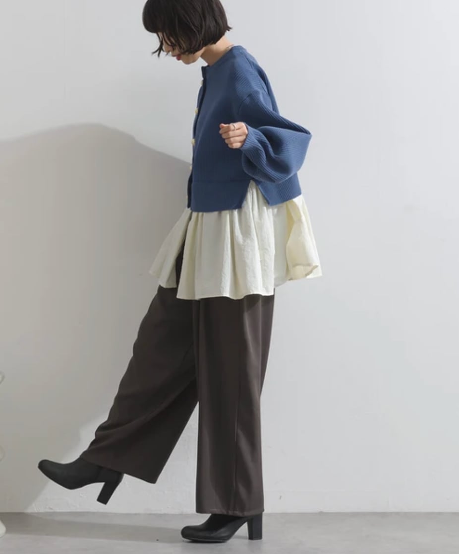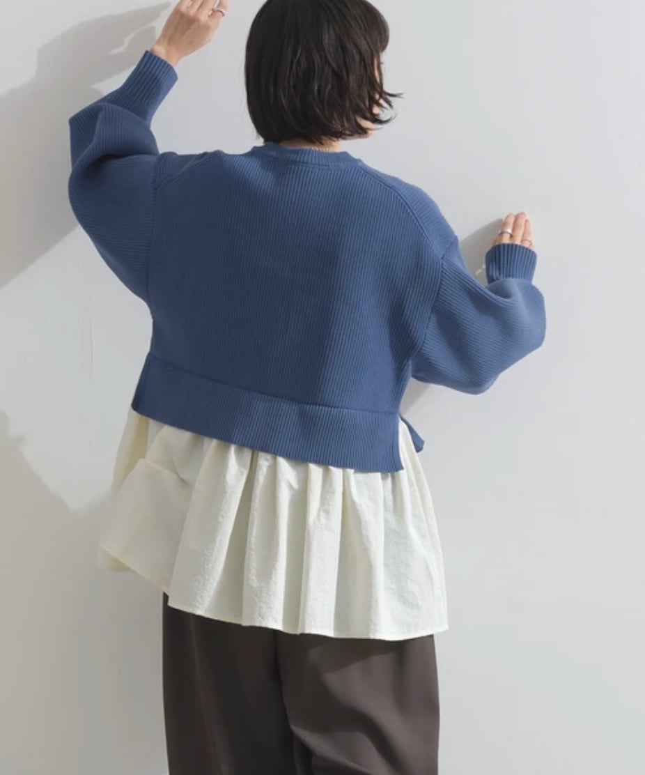 立体感のあるニットの風合いと、軽やかなシャツ素材のコントラストが新鮮な印象を演出します。