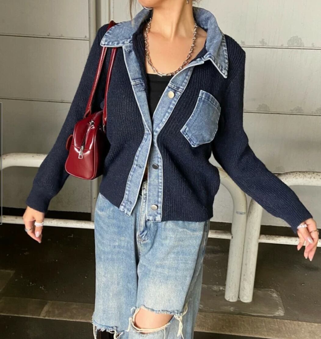 ■ 着るだけで存在感のあるデニム×ニットがドッキングしたニットカーディガン。