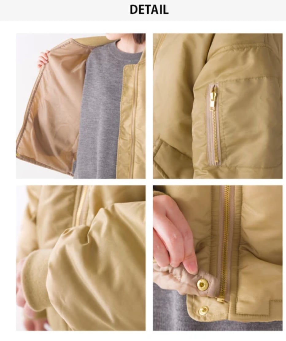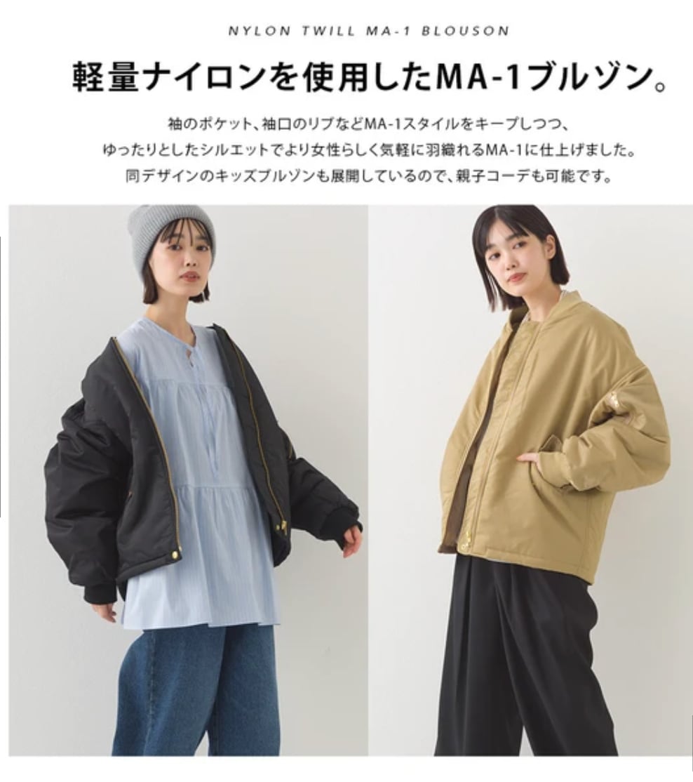 ■軽量ナイロンを使用したMA-1ブルゾン。袖のポケット、袖口のリブなどMA-1スタイルをキープしつつゆったりとしたシルエットでより女性らしく気軽に羽織れるMA-1に仕上げました。