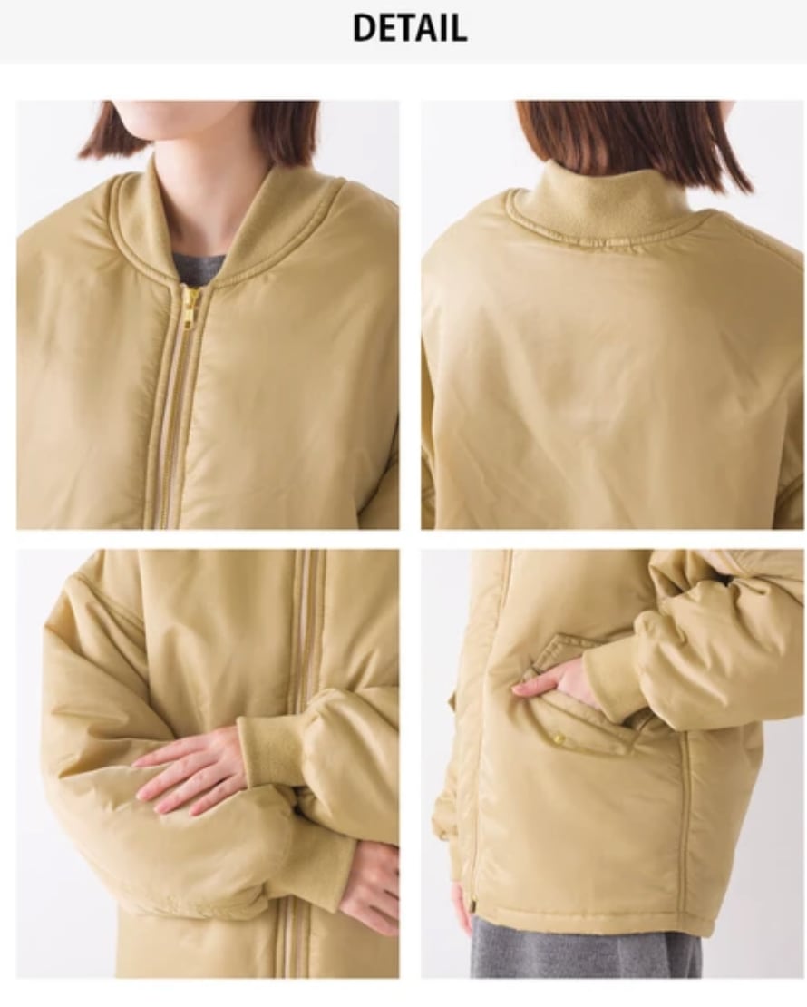 ■軽量ナイロンを使用したMA-1ブルゾン。袖のポケット、袖口のリブなどMA-1スタイルをキープしつつゆったりとしたシルエットでより女性らしく気軽に羽織れるMA-1に仕上げました。