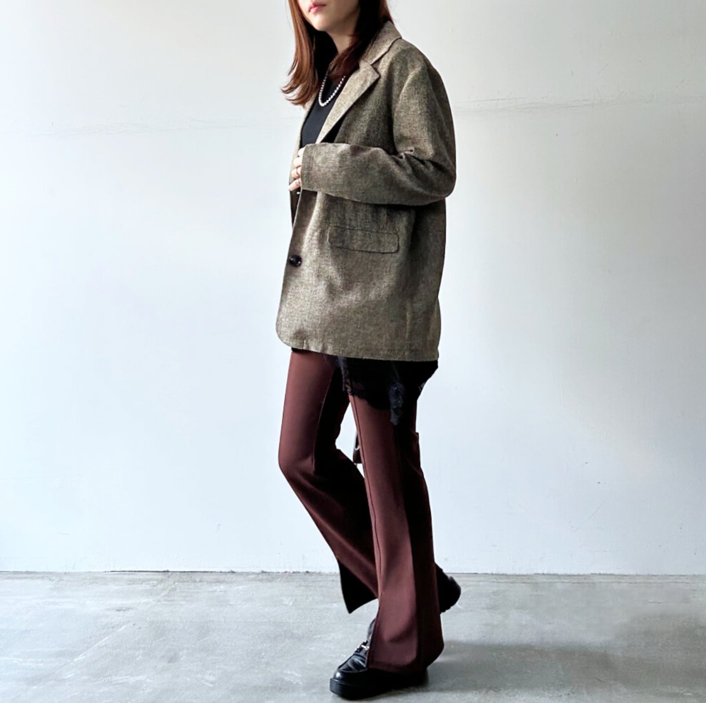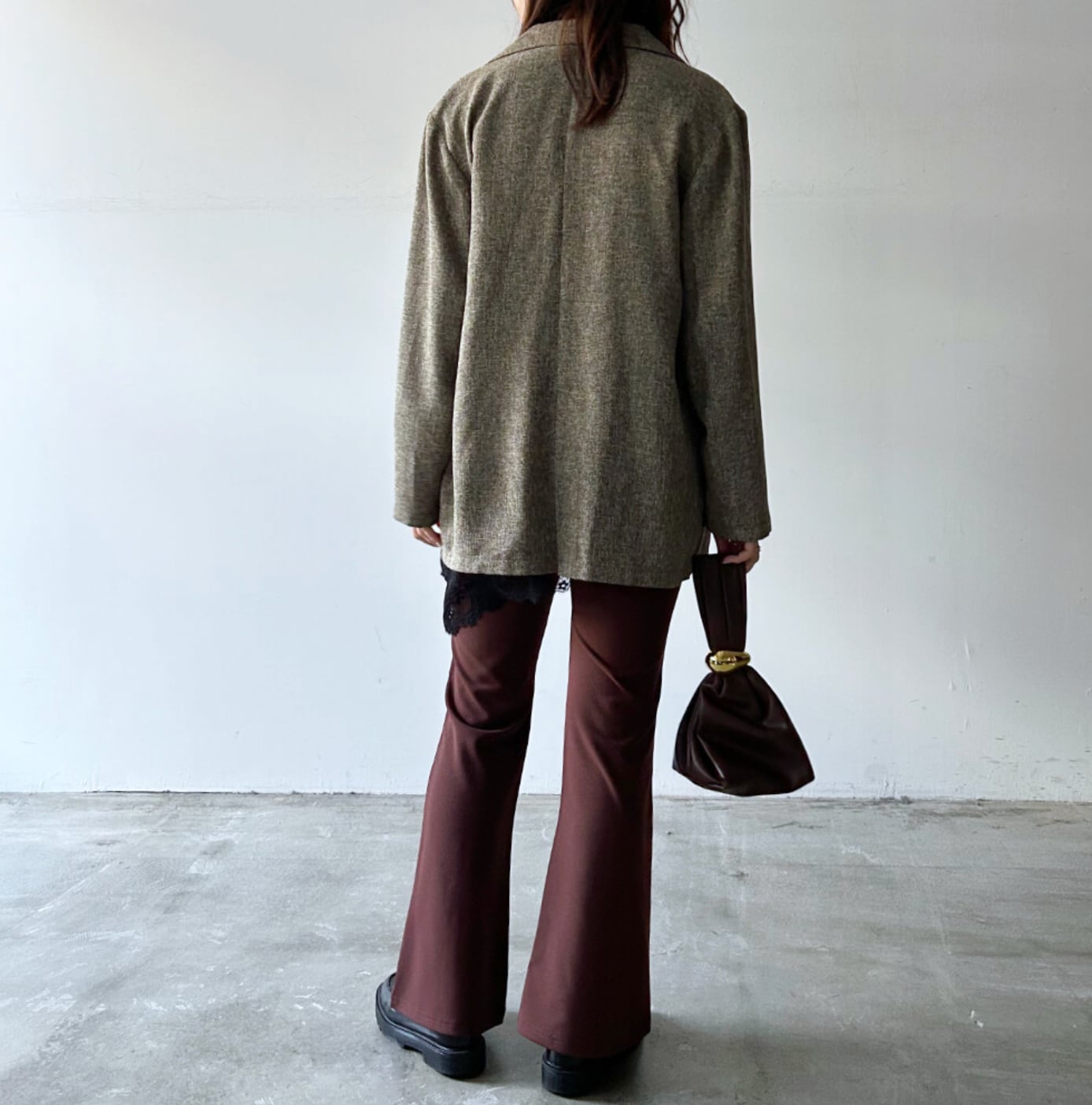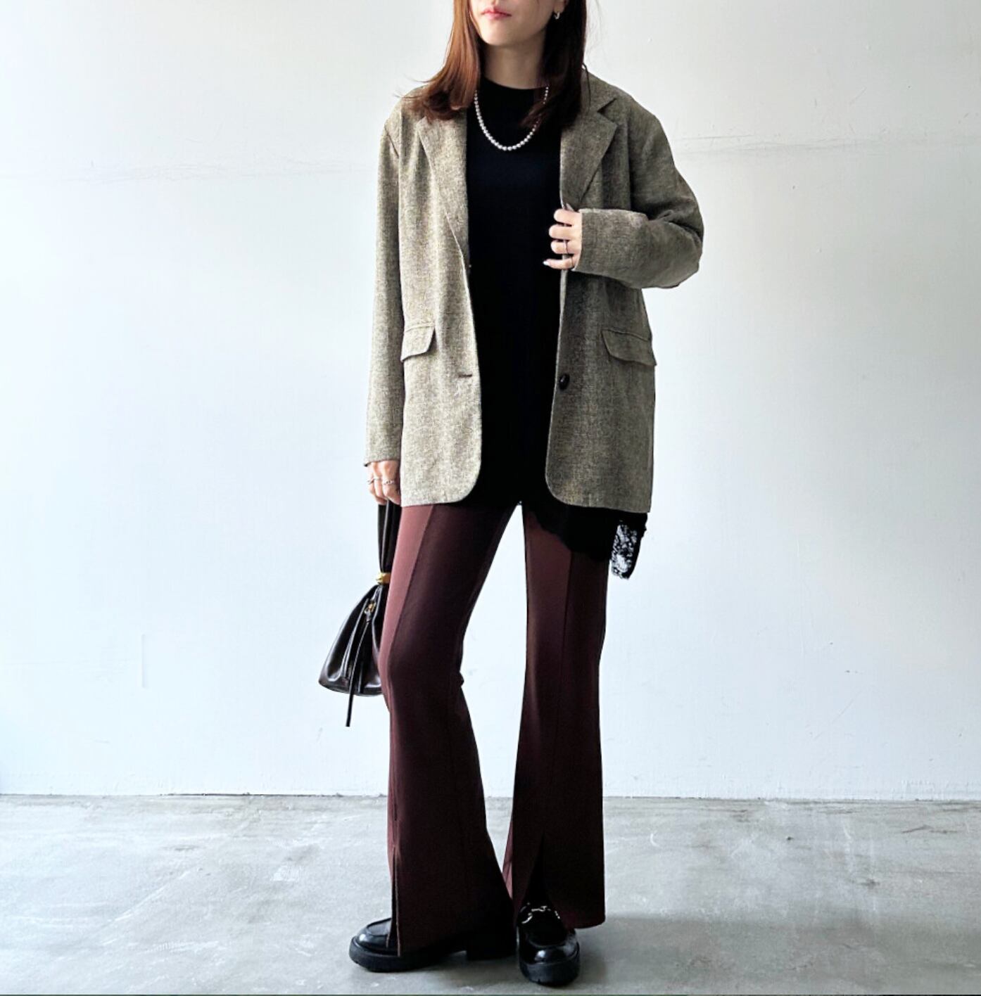 縦ラインを意識したフレアシルエットが、脚を長くきれいに見せ上品な印象に仕上げてくれます。