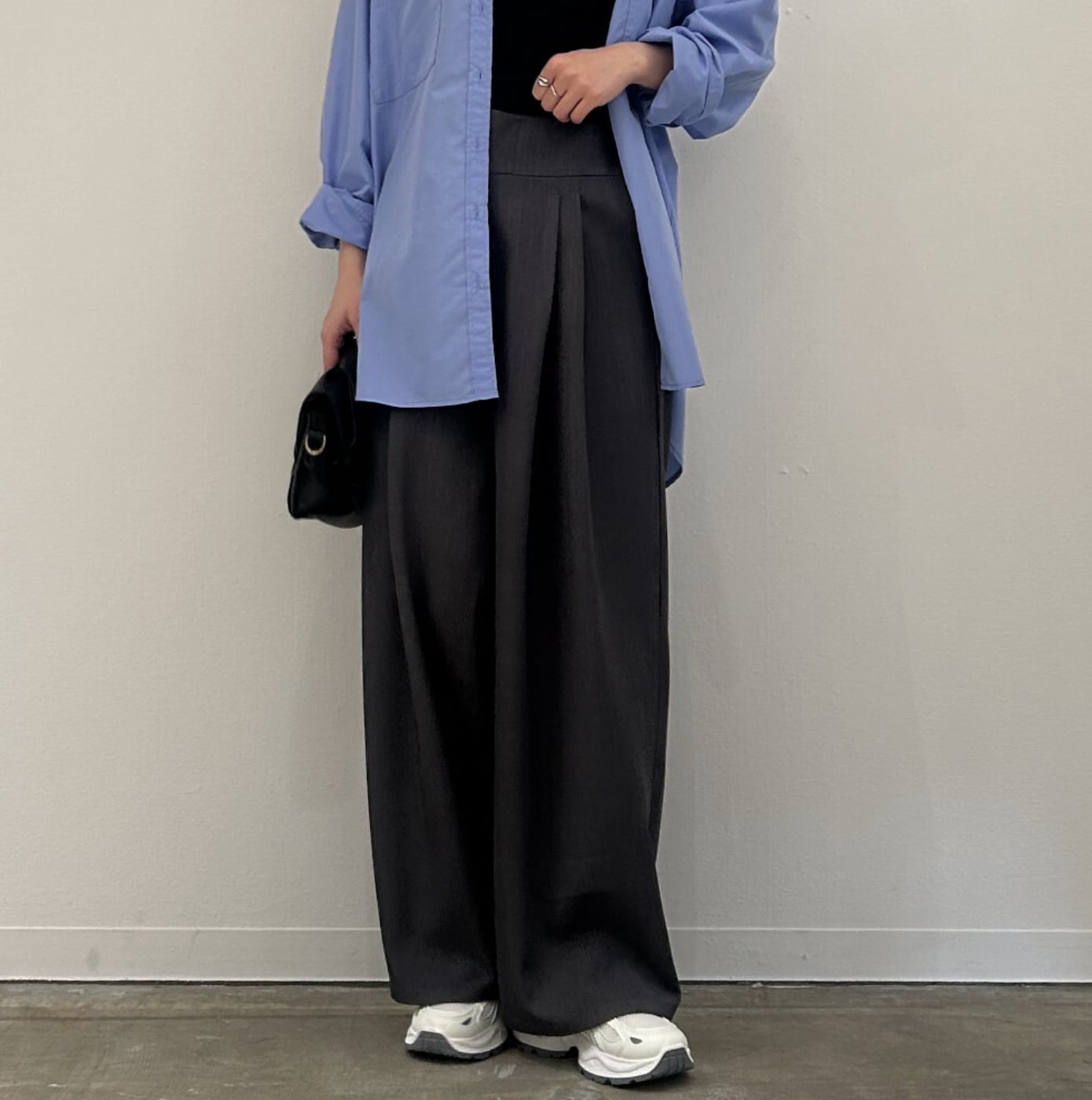 ウエストの配色ベルトが程よいアクセントになり、トップスインのスタイリングも映えます。