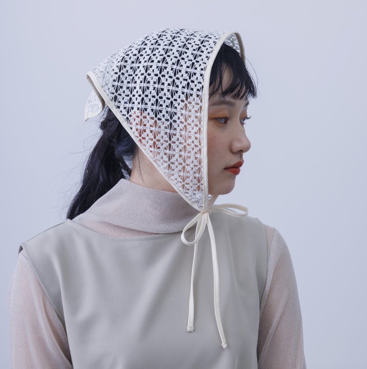 ◆This babushka is made of delicate lace for a lovely look.