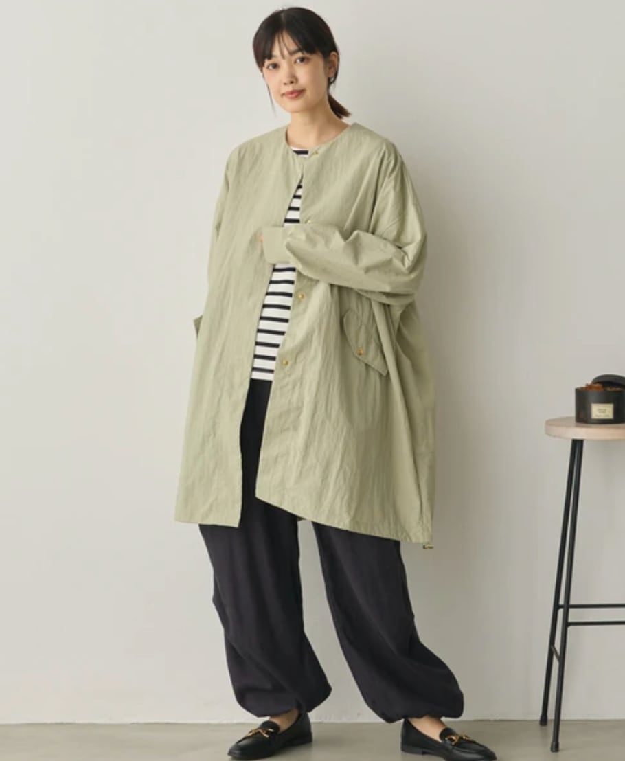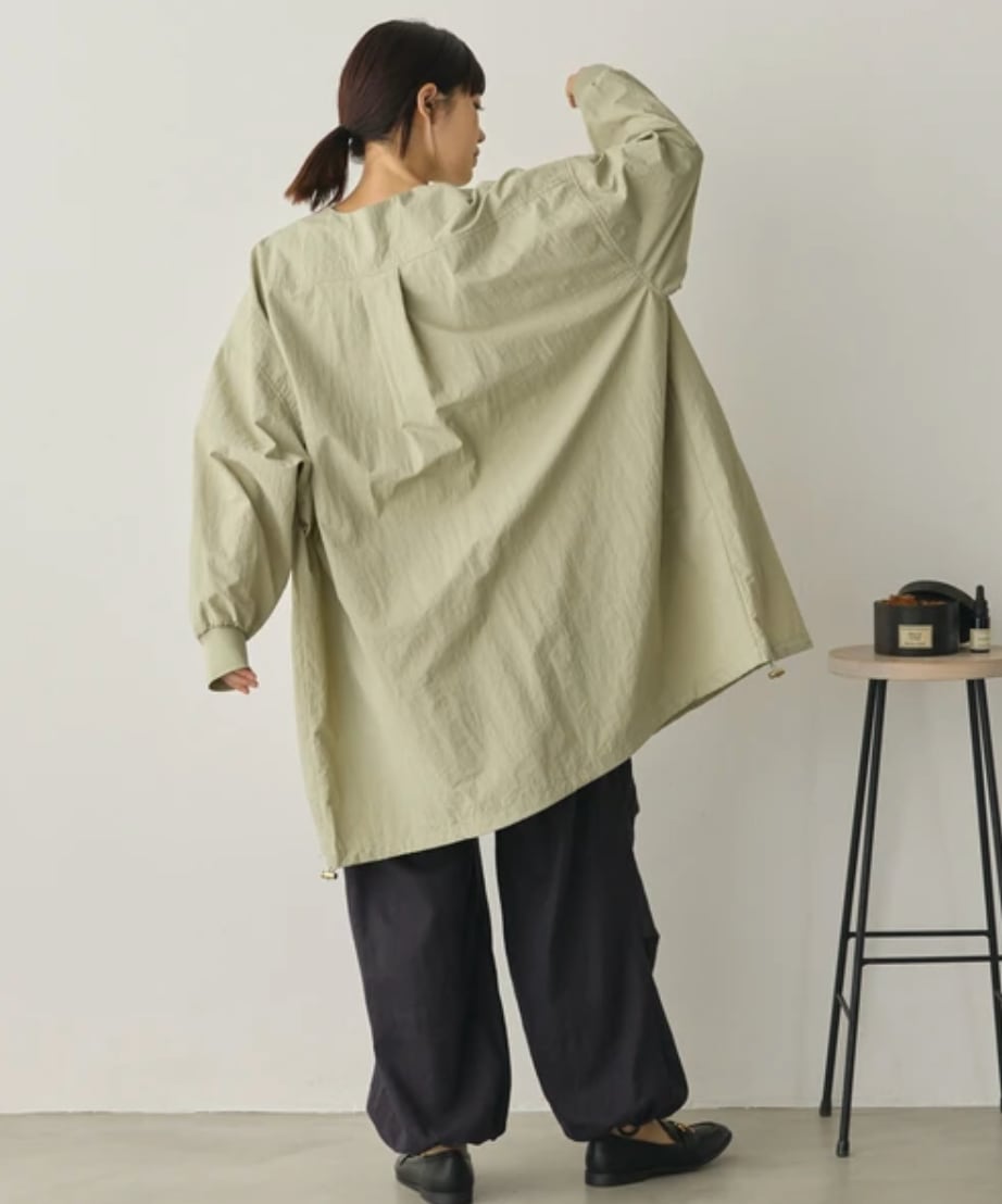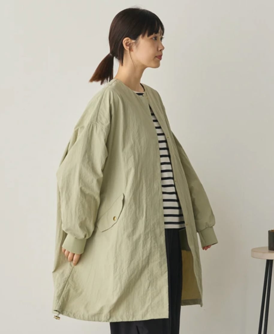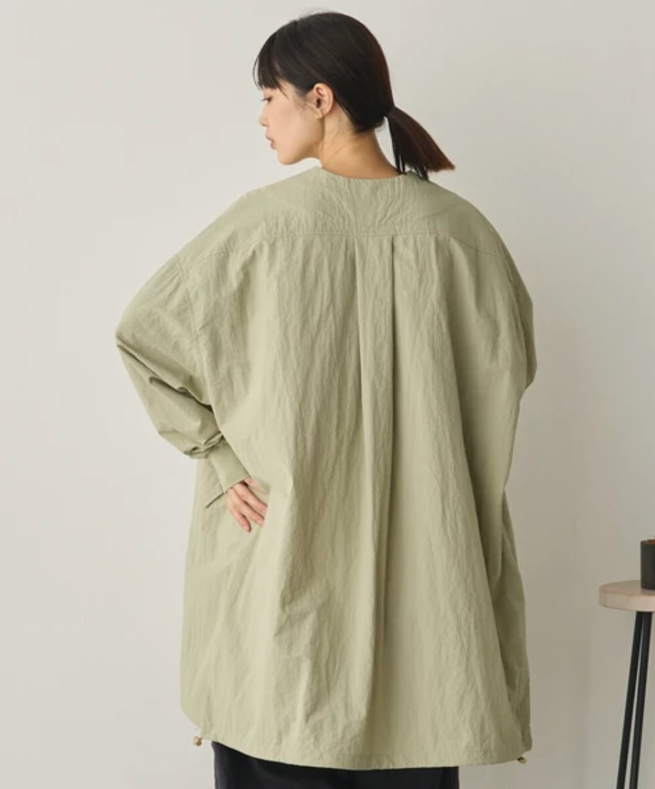■ シワ加工、撥水加工を施したナイロンタスラン生地を使用したノーカラーデザインのロングジャケット。