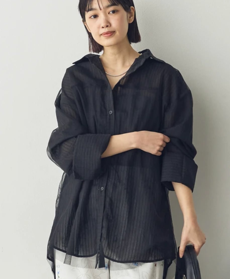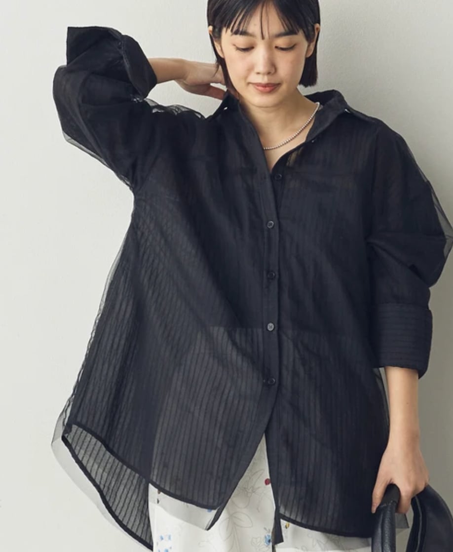 ほんのりとした透け感が抜け感と女性らしさを演出しながらも、甘くなりすぎない絶妙な