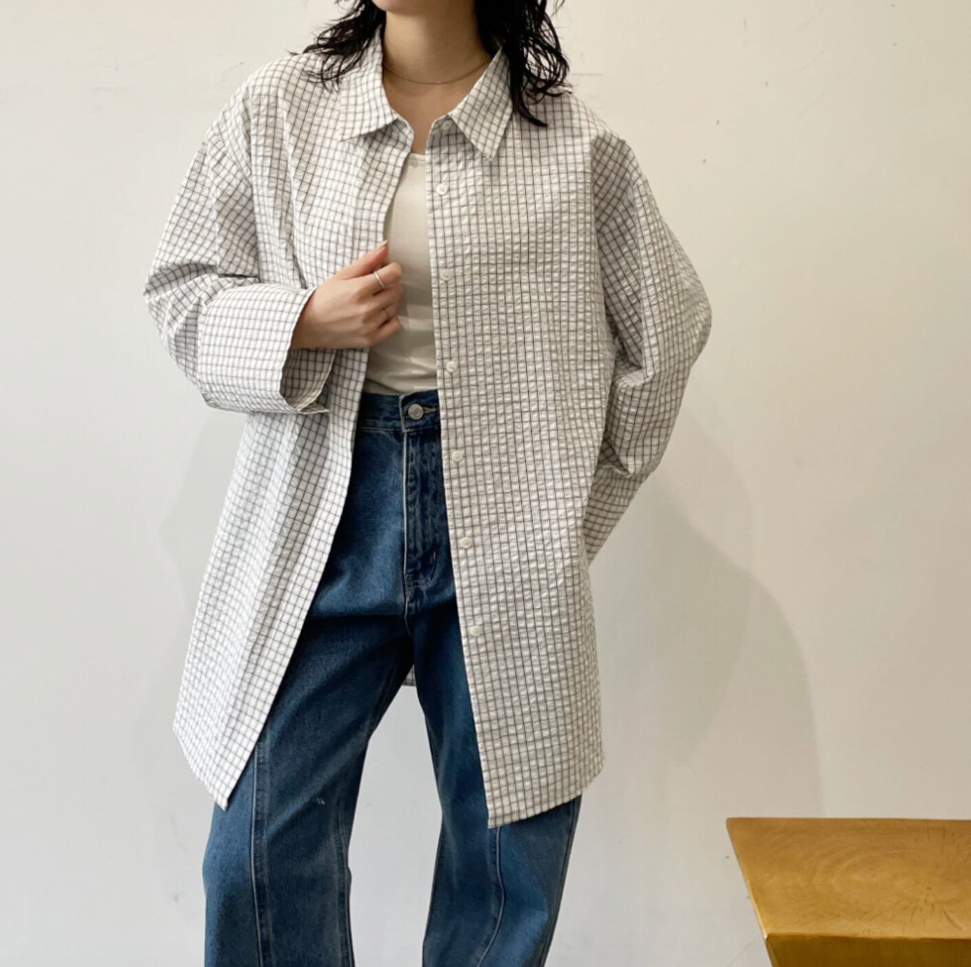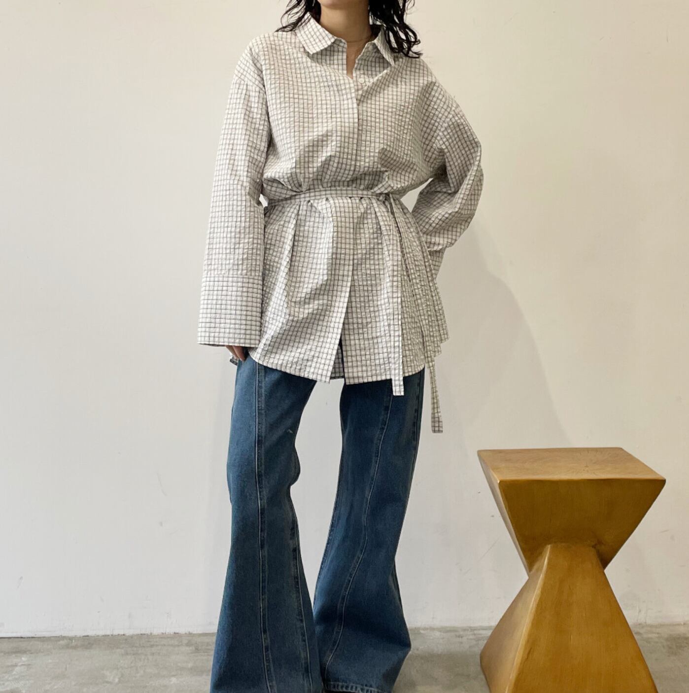 ◆An oversized shirt combining a textured seersucker fabric with a check pattern.