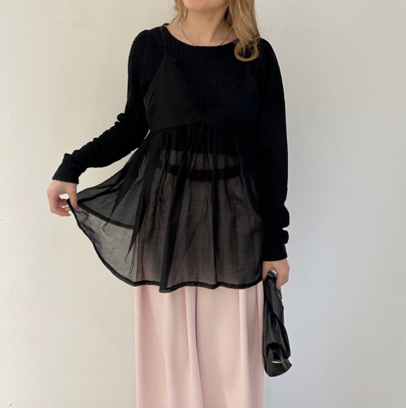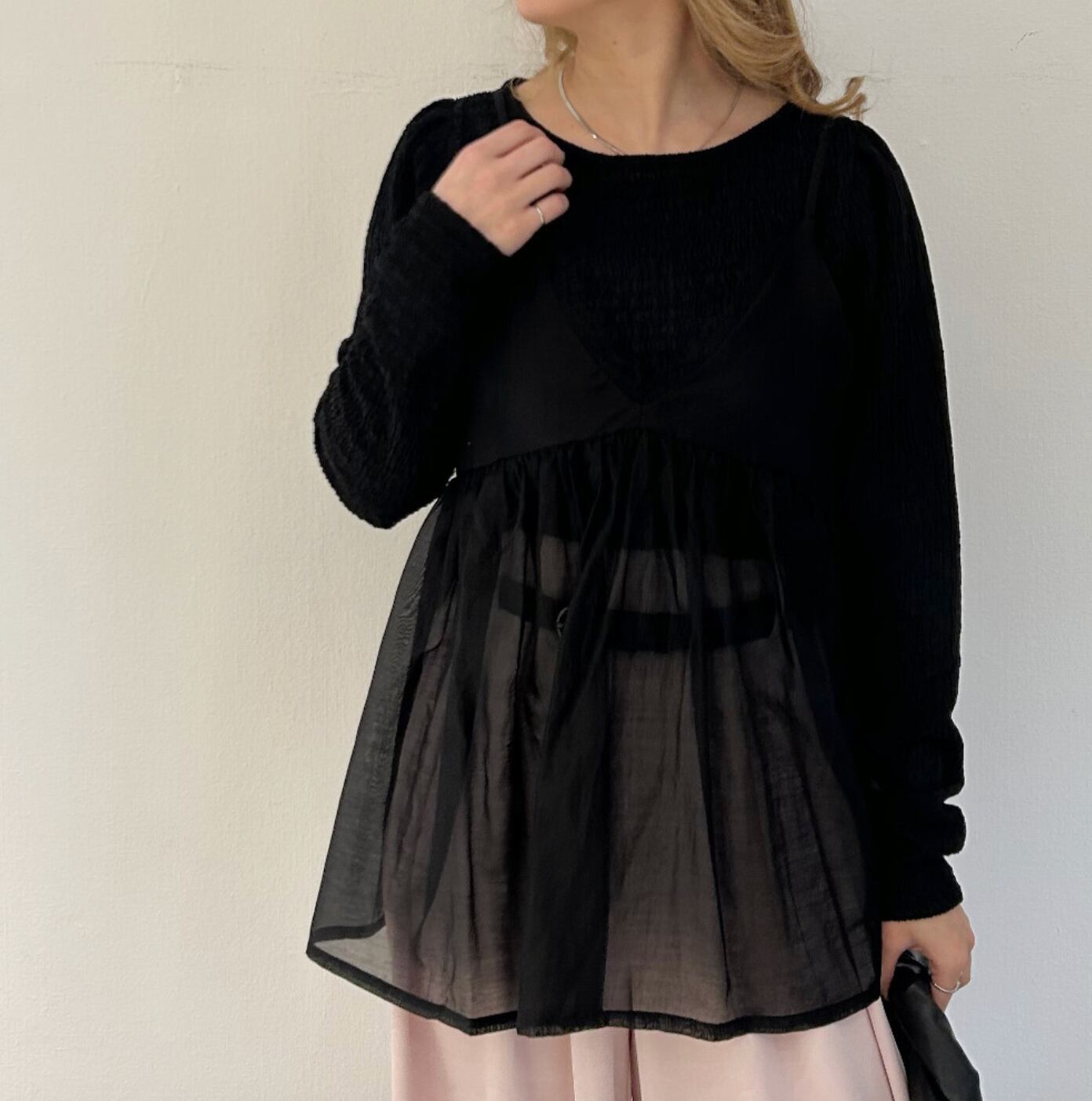 透け感のある軽やかな素材で、春夏のレイヤードスタイルにぴったりです。