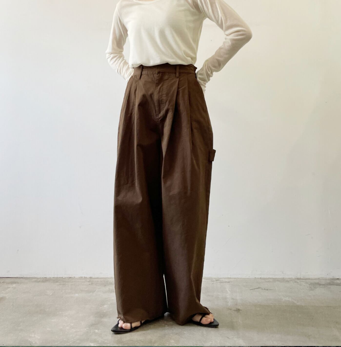 ウエストにタックが入り、裾に向かってストンと落ちるシルエットは脚長効果もありスニーカーやブーツとも相性抜群。カジュアルスタイルを格上げしてくれる1本です。