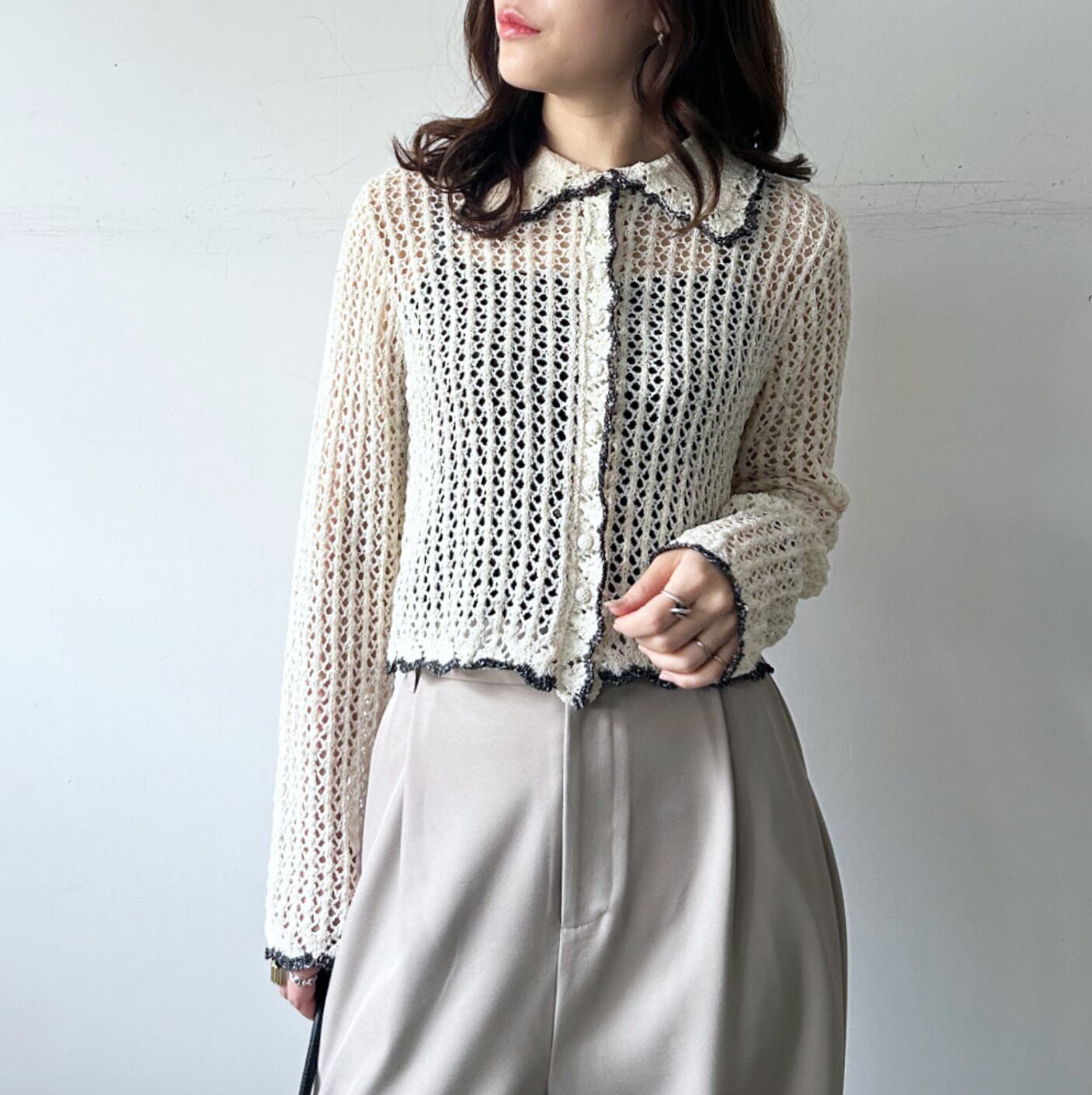 ◆A nep mesh cardigan with contrasting color lines as a key design element.