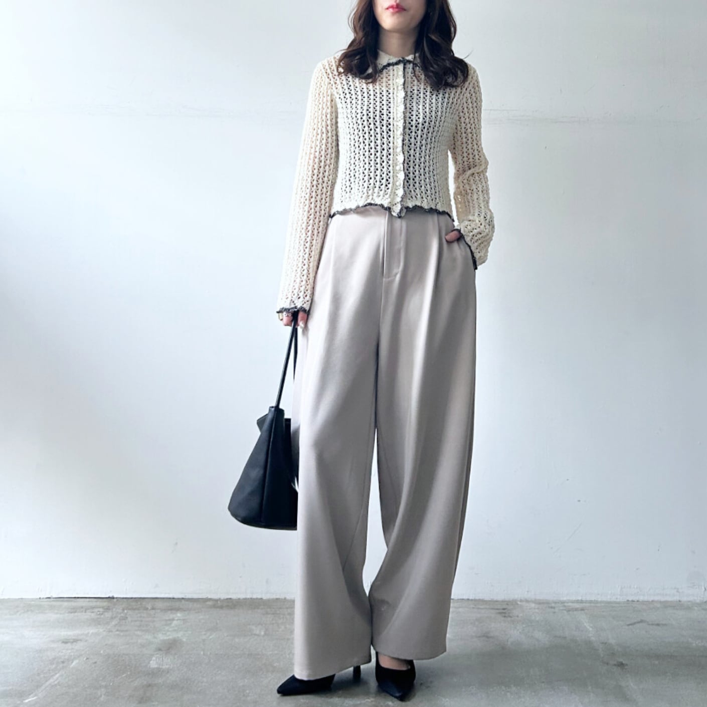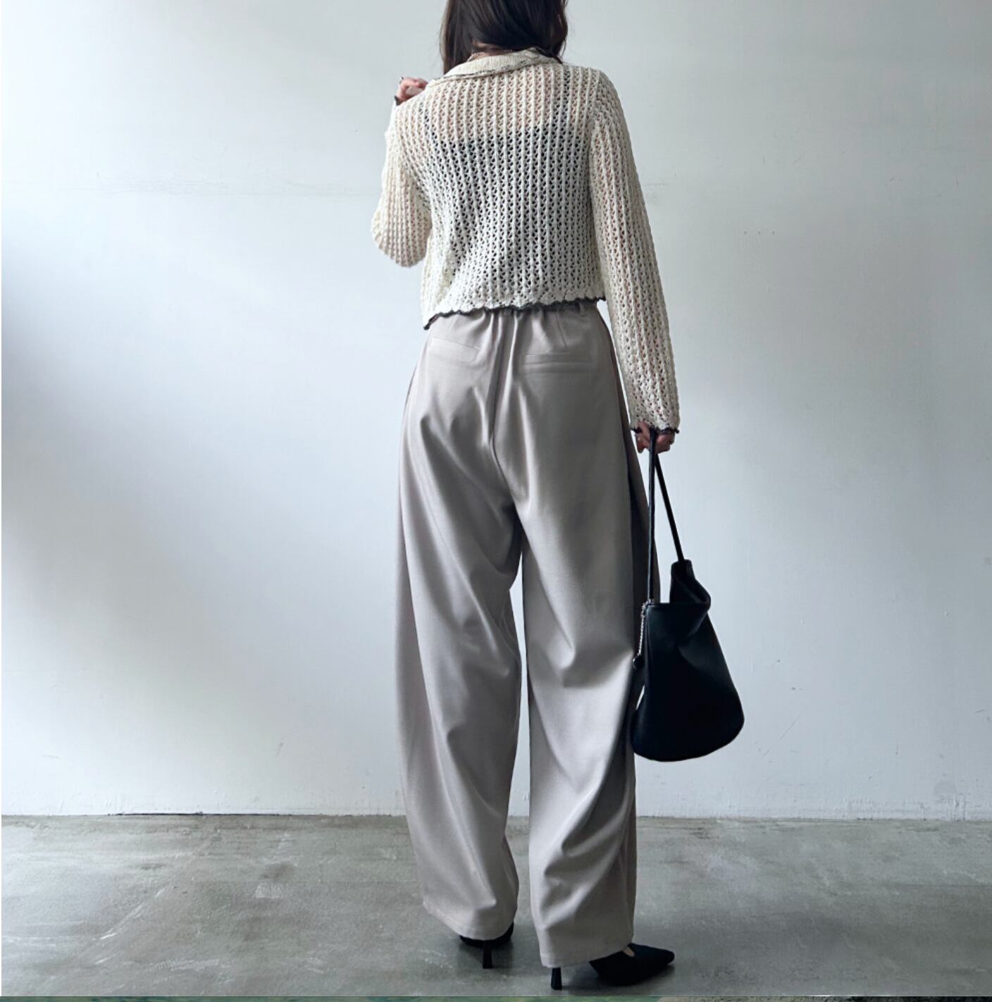 軽やかな透け感と立体感のある編地が、スタイリングに奥行きをプラスします◎