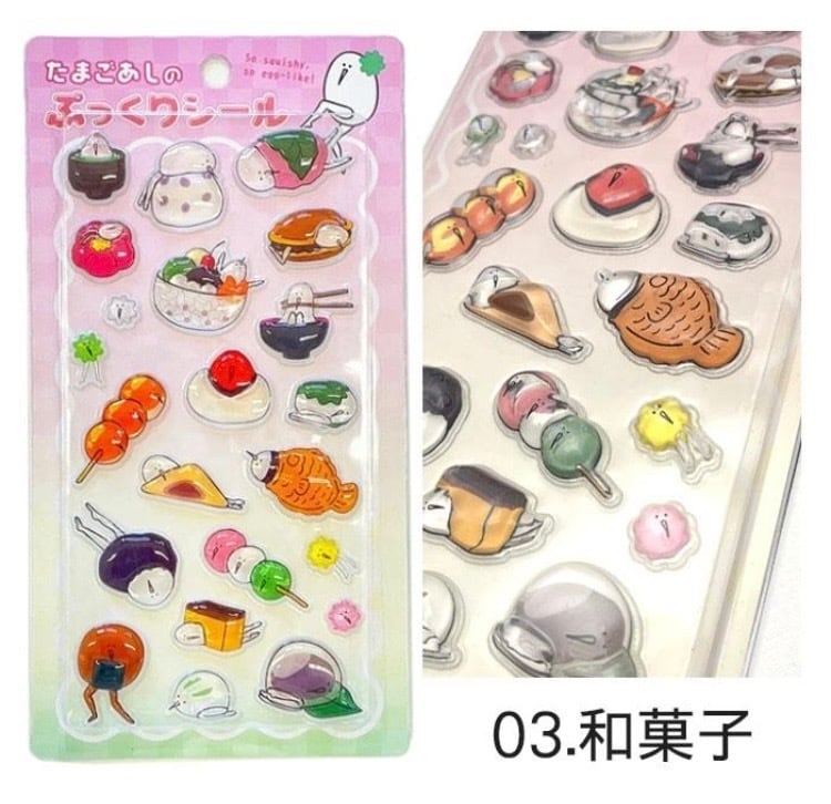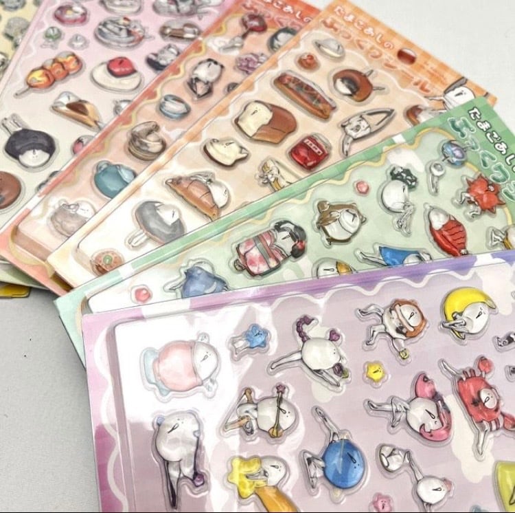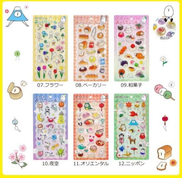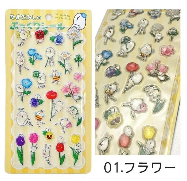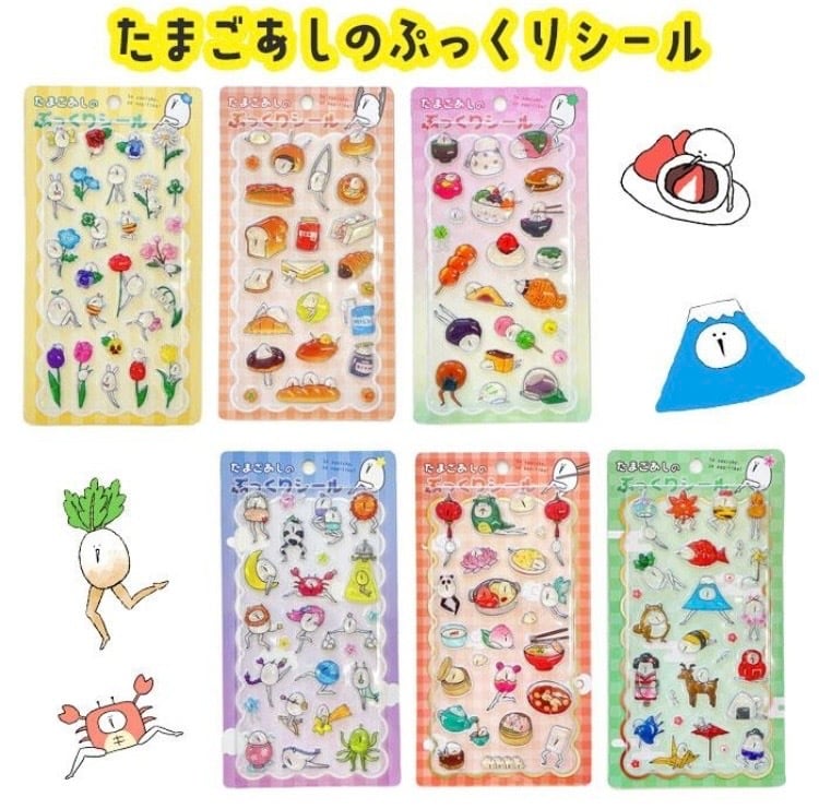 人気のぷっくりシールが、たまごあしデザインで登場!ころんとした立体感と、ゆるい表情がなんともいえない可愛さです♪手帳やスマホケース、小物デコにもぴったり◎思わず集めたくなる、今注目のシールシリーズです。お友達とのシール交換にも!