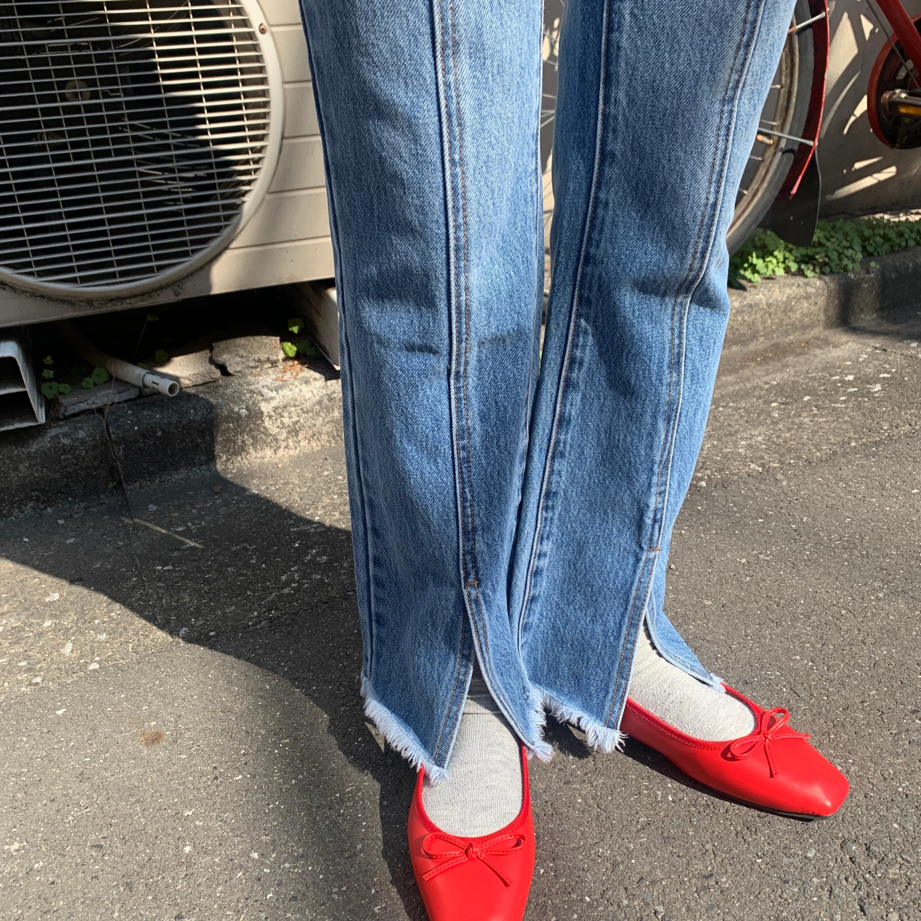 前の裾部分にスリットが入っているのでブーツやトレンドの大きめスニーカーなどと合わせやすい!